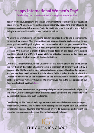 On this day, at The Guernica Group, we want to thank all those women —lawyers, practitioners, victims, and leaders— who accompany and inspire us in our common struggle for justice, devoting their time and efforts to overcome and prevent the enduring consequences of gender discrimination and violence.
